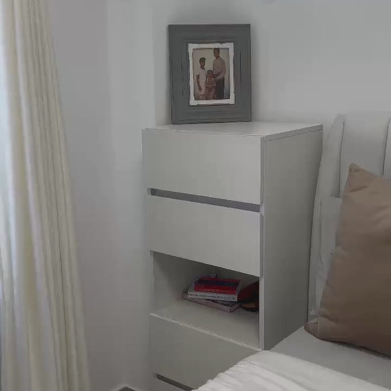 Top drawers keep clutter tucked away, while the open bottom shelves give you easy access to books, décor, or everyday essentials.