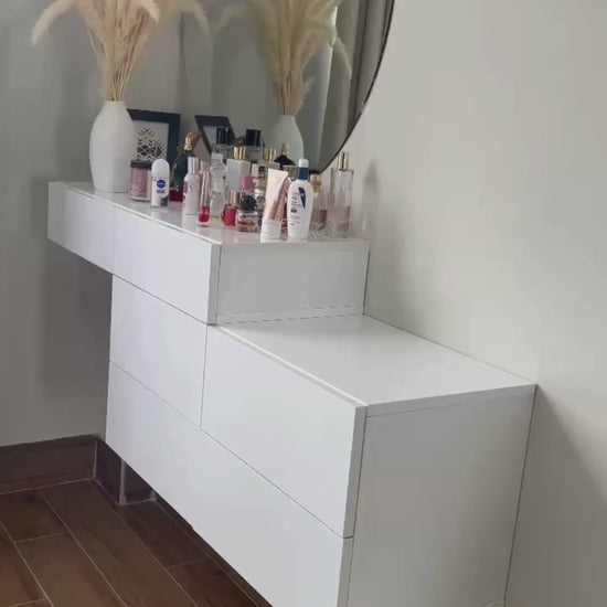 Stepping through the doorway, you’re greeted by The Karibu Console seemingly suspended against the wall in a gentle welcome. Its gloss-white surface catches the light, reflecting a sense of calm and quiet luxury into your foyer. With a seamless, handle-free design, this floating console keeps the look clean and uncluttered – perfect for stowing keys or displaying a favorite vase without visual fuss. Whether acting as an entryway centerpiece or a minimalist vanity, it brings a bold yet understated elegance that flows effortlessly into modern coastal living.